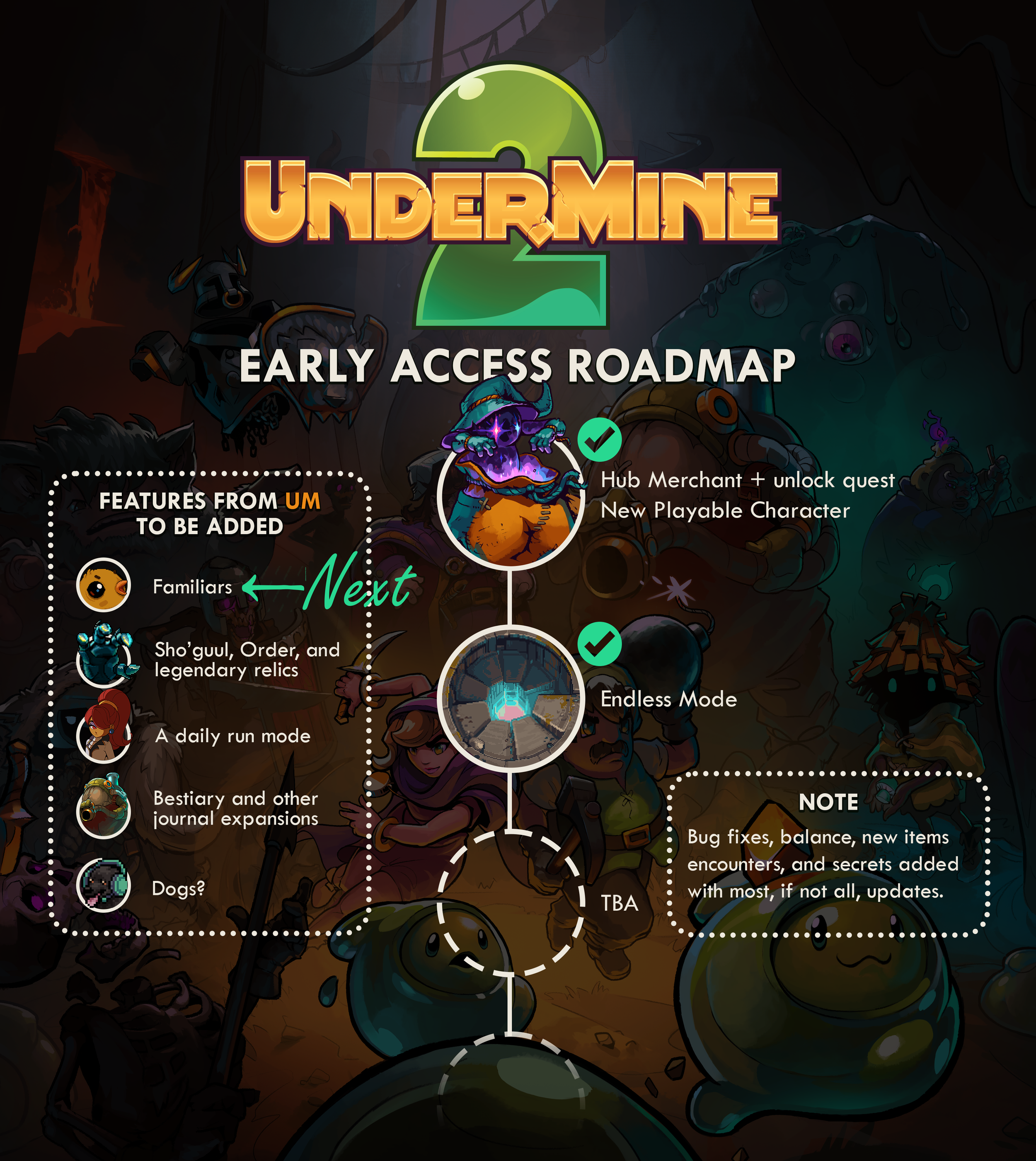 Welcome to UnderMine 2’s near-term roadmap. We have a lot of planned features we’d like to add, and this will give you an idea of their priority. Please note: some features from the original UnderMine, seemingly missing from UnderMine 2, will return. They were intentionally left out of the Early Access launch so that we can devote more time and resources to their development. These features include: Familiars, Demons, Legendary Items, a daily run mode like WHIP, and more.